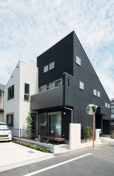 外観はデザイン性の高いスタイリッシュな建物です。お施主様がお若いこともあり、コミュニケーションを通じて具現化すると、このような設計になりました。 外壁はモルタル吹付け仕上げで、奥と手前とで外壁の色を変えることで、立体感・重厚感が増しています。 そして、なにより見た目にはわからないですが、健康や高耐久の効果を造る次世代高性能住宅なのです。