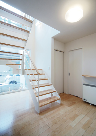 階段の奥に大きなFIX窓を設けました。 そのことで大量の光を取り込み、明るい住空間を演出いたしました。