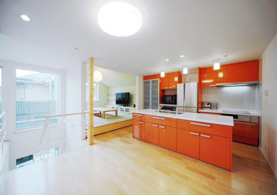 家族の交流を大切にしたいというお施主のご要望を形にしました。 キッチンはアイランドキッチンで、料理しながら家族とのコミュニケーションをとりやすい設計になっています。