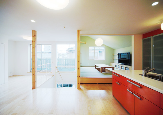 家族でくつろぐのは畳のお部屋でというお施主のご要望でした。部屋の中心部には掘りこたつです。 ちなみにこのこたつは大工手作りで、折りたたみ式になっています。